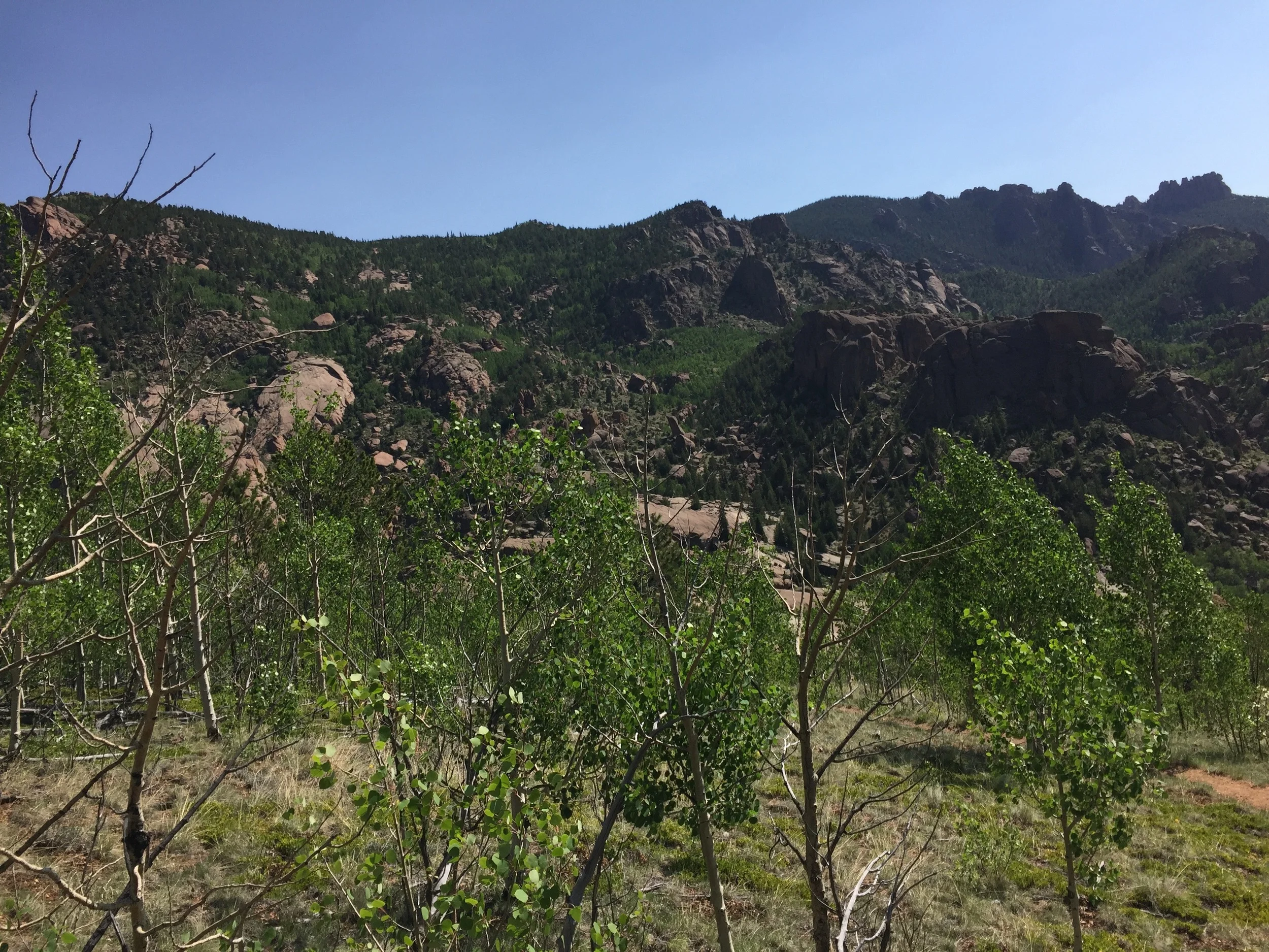 After a sleepless night (combination of AMS, acute sleep apnea, and damn mosquitoes) I decided to make it back to the car by dusk. I didn't care if it was a forced ruck march, I was making back to the car by nightfall. Unfortunately that resolve took over everything that happened that day. I refilled my water containers at every opportunity but I didn't focus on any personal hygiene (feet, balls... you get the picture) that morning and I paid for it dearly by days end. I marched at a brisk pace past the McCurdy Park Tower and down into the Lost Creek valley. The red rock formations were really beautiful, but taking photos was tough as I was typically below the aspen tree line for much of the valley. My feet were killing me and the trail appeared to never stop going up and down. Now I've climbed over 40 14ers but this seemed like I was climbing 3 14ers in the same day. Unreal. I was cussing the entire way.